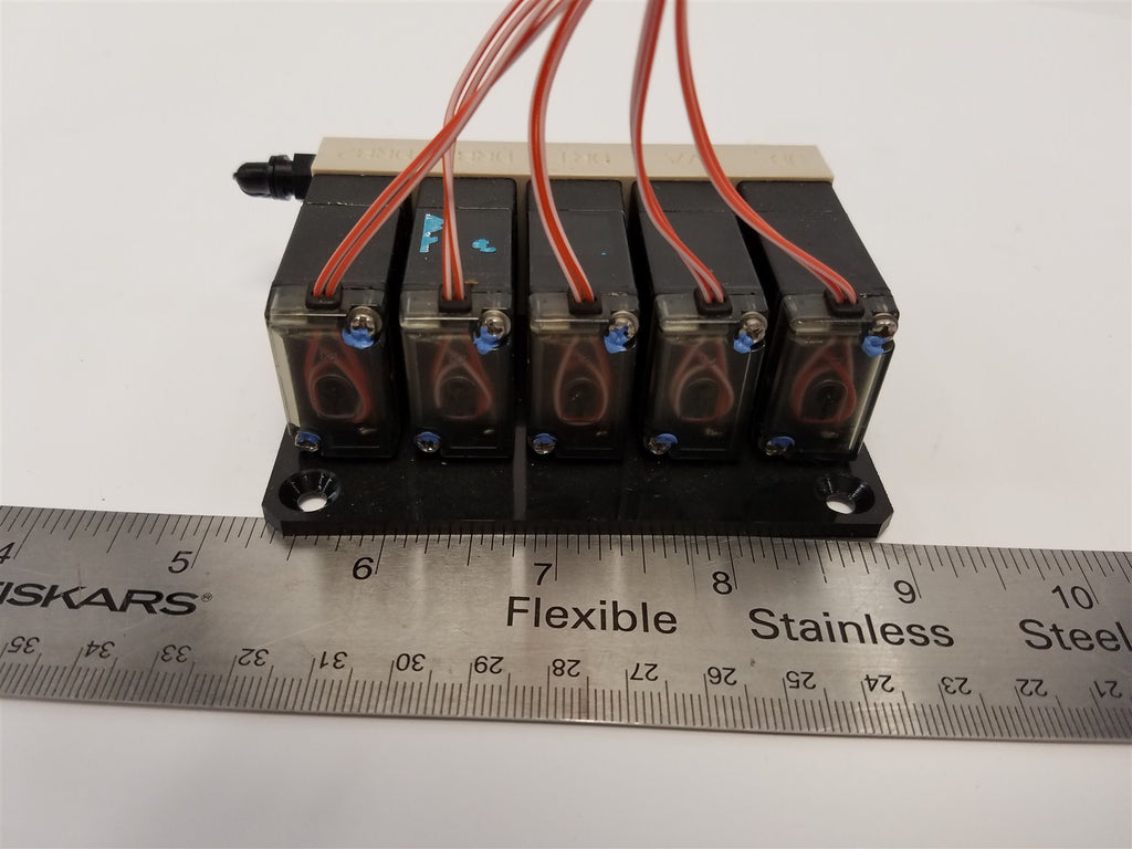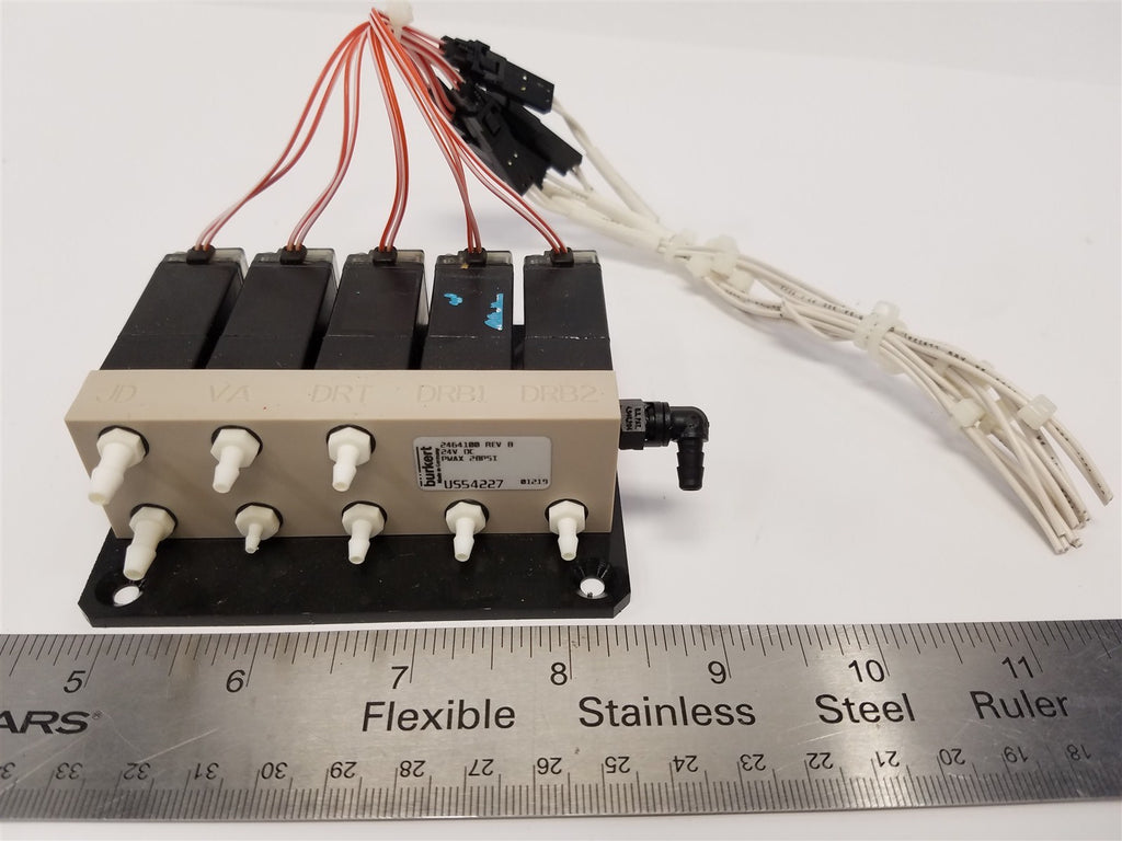 BURKERT MANIFOLD +(5) SOLENOID VALVES US54227 ROCKER REV B 24V DC 28PSI 5Y 0217