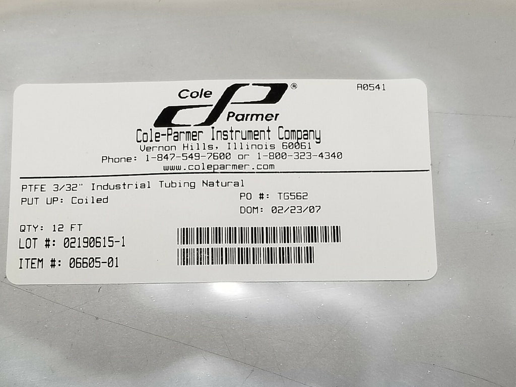 12ft Package Cole Parmer 3/32" Natural PTFE Masterflex Transfer Tubing 6605-01